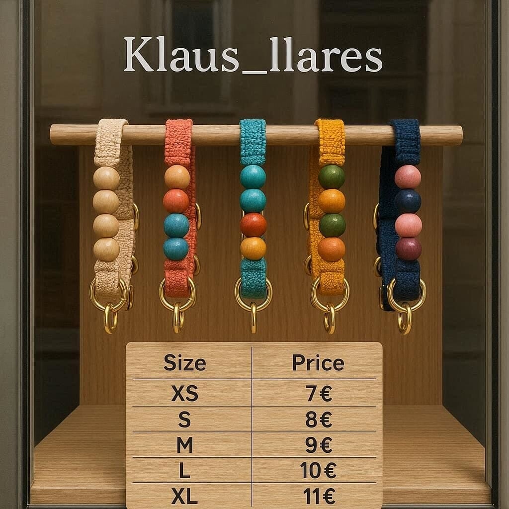 Descubre la colección de collares de Klaus_Llares , diseñados con amor y hechos a mano para ser tan únicos como tu mascota. Aquí es donde la personalidad y la comodidad se unen en una pieza especial. Imagina los colores, el estilo, el tipo de cuentas, con o sin nombre....y nosotros lo haremos realidad para que tu compañero brille como nunca.